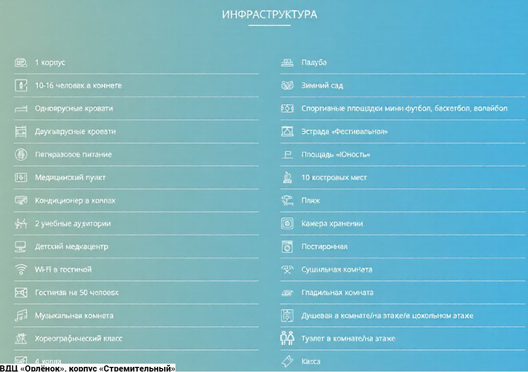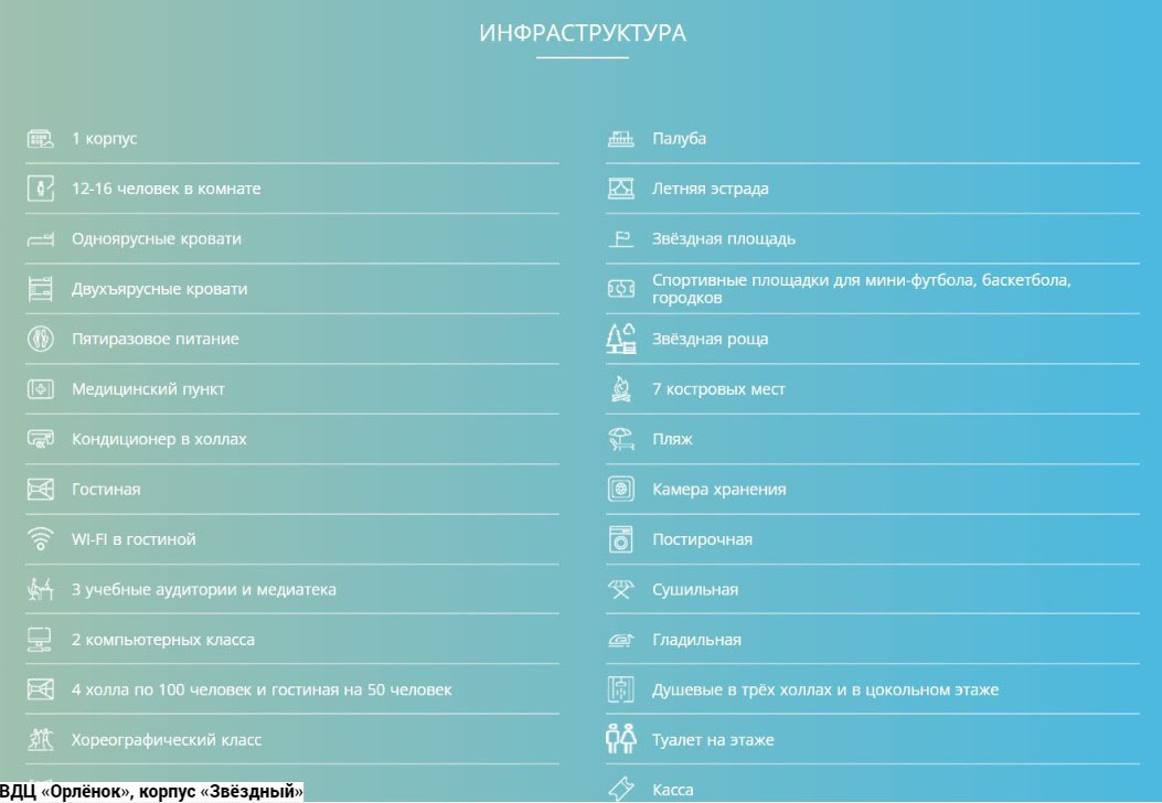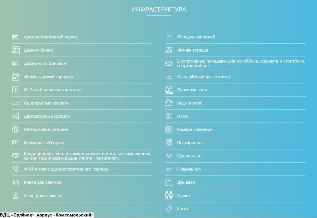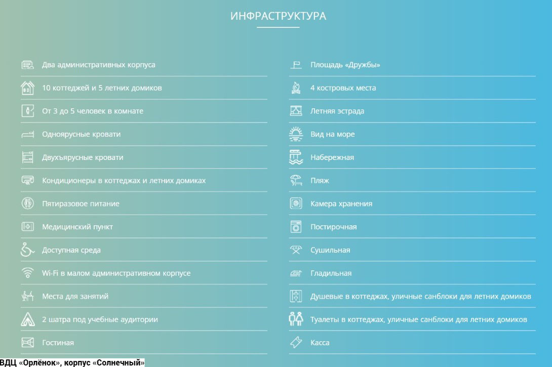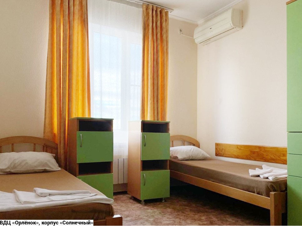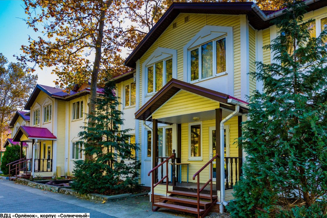 Лагерь «Солнечный»: коттеджи и летние домики. В первых санузел на этаже, во вторых - на территории. Домики рассчитаны от 3-10 чел. в комнате. Жилые детские помещения оборудованы одноярусными, двухъярусными кроватями. Расположен на самом берегу моря и представляет собой комплекс из современных летних домиков, коттеджей. Лагерь рассчитан на 350 мест Вне зависимости от того, какая программа реализовывается в определенной смене, каждый ребенок в рамках этой смены готовит собственный проект. Это может быть акция, дискуссия, конкурс, эстафета и так далее. Здесь это называют Приключением. Кроме того, каждый участник смены выбирает для себя определенный «Маршрут безопасности», после прохождения которого ребята учатся: защищать свои права, искать тех, к кому можно обращаться при нарушении этих прав; контролировать свое здоровье, оказывать другим людям помощь при несчастных случаях; ориентироваться на местности, ставить палатку, разжигать костер, преодолевать препятствия, работать в команде. Возраст детей от 11 до 16 лет.