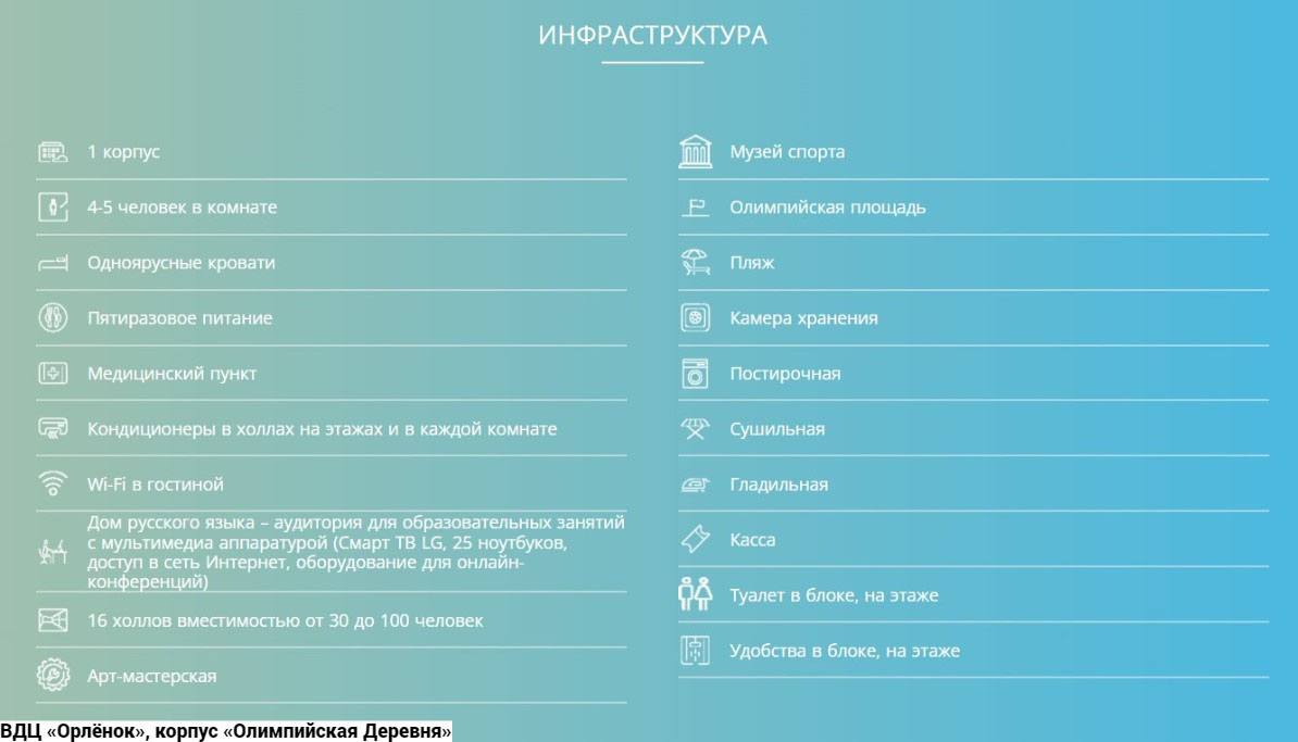 Лагерь «Олимпийская деревня»: 3х этажное здание с номерами по 4-5 человек с удобствами на блок из двух комнат. Он расположен при въезде в ВДЦ «Орленок», рассчитан на 250 мест. У каждого отряда здесь есть уютный холл для занятий и встреч, камера хранения, комнаты для стирки и сушки белья, оборудованные необходимой современной техникой. Несколько слов нужно сказать об учебных программах, реализуемых на базе лагеря: это программа «Клубный век» (социальная адаптация), «Большая орлятская экспедиция» (эколого-туристическая направленность). Мальчишки и девчонки посещают Пожарно-техническую выставку, Дом Авиации и Космонавтики, Астрономическую обсерваторию. Возраст детей от 11 до 16 лет.